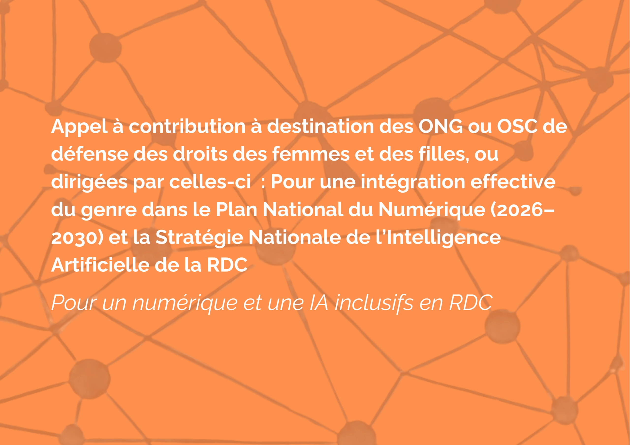 L’objectif de cet appel est de recueillir les contributions des organisations congolaises œuvrant dans les domaines du genre, de l’inclusion, de la gouvernance, du numérique, de l’éducation ou des droits humains, afin d’enrichir la note de plaidoyer nationale. Les organisations intéressées doivent être légalement constituées, actives sur le terrain, et disposer d’actions avérées en matière de genre, d’inclusion ou de développement technologique (Toutes les Provinces sont éligibles).